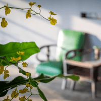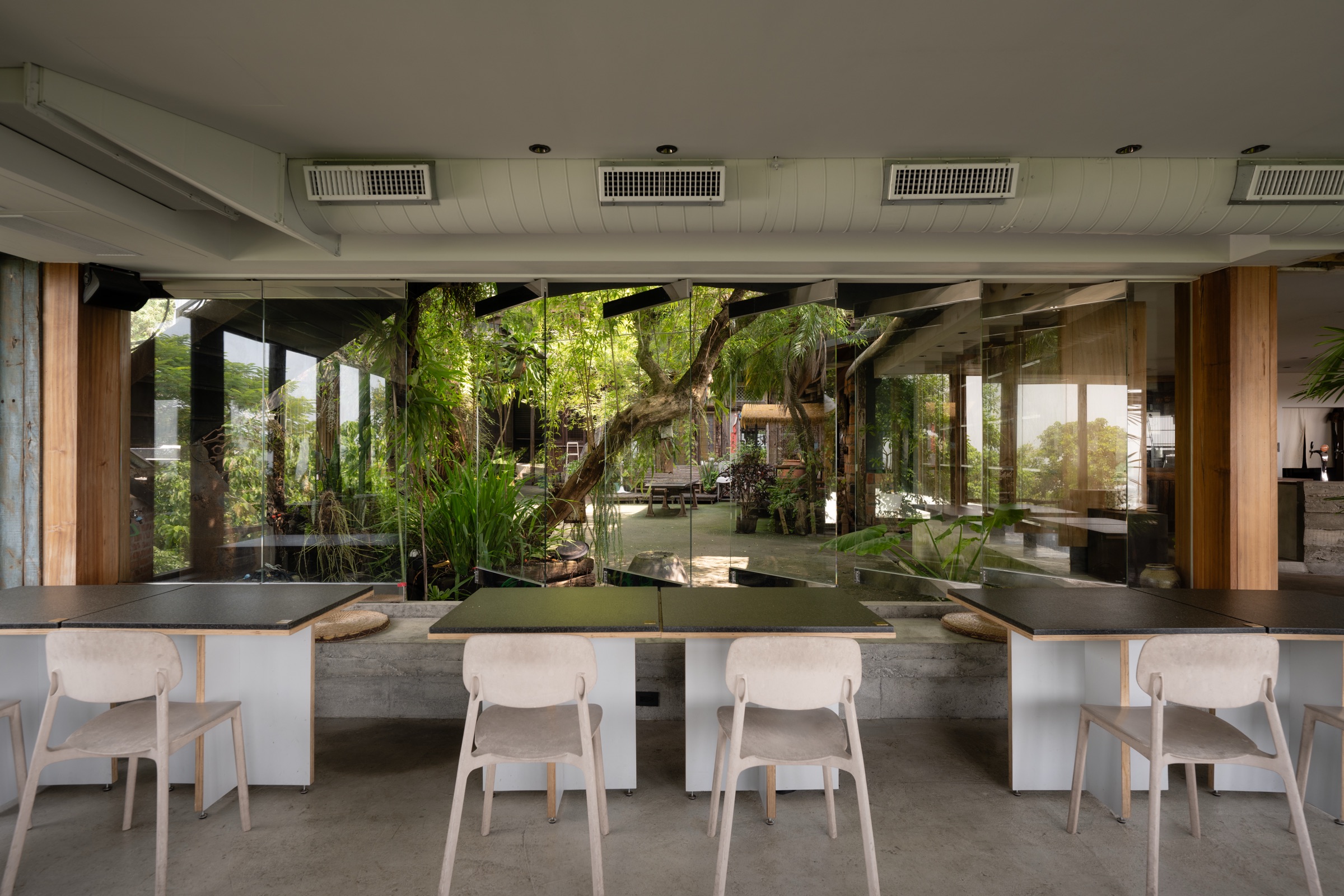 走到外面,找一張桌子坐下。頭上是天,旁邊是樹。