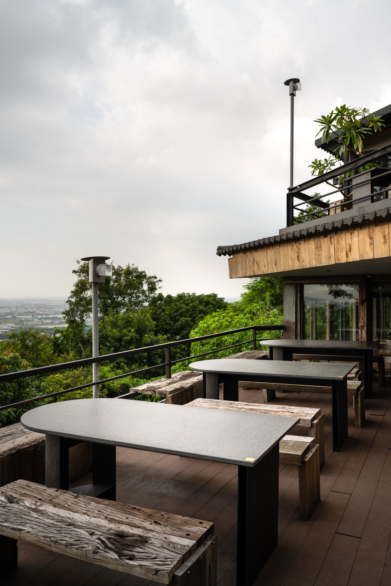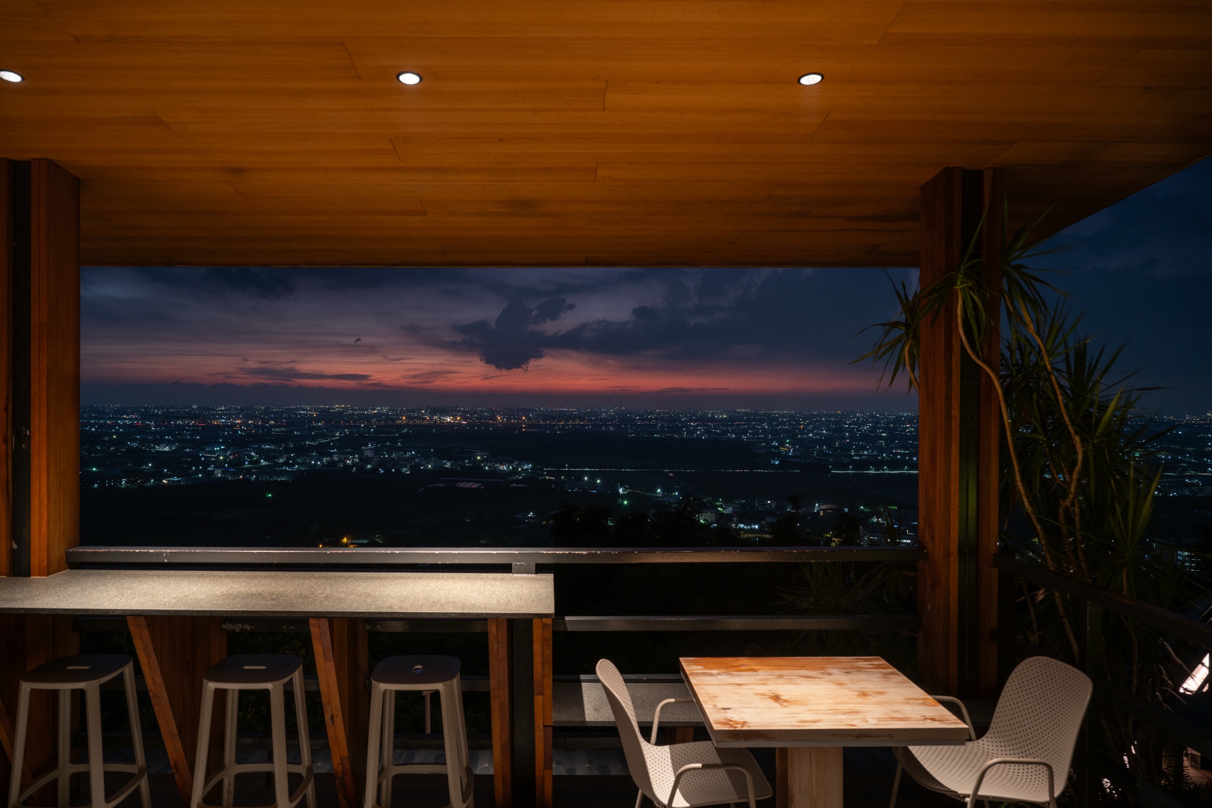 下午太陽從山的另一邊慢慢沉下去,桌上的光從金黃、到橘紅、再到夜色。 天色暗透後,山下那一整座城市的燈火就會一顆一顆亮起來。